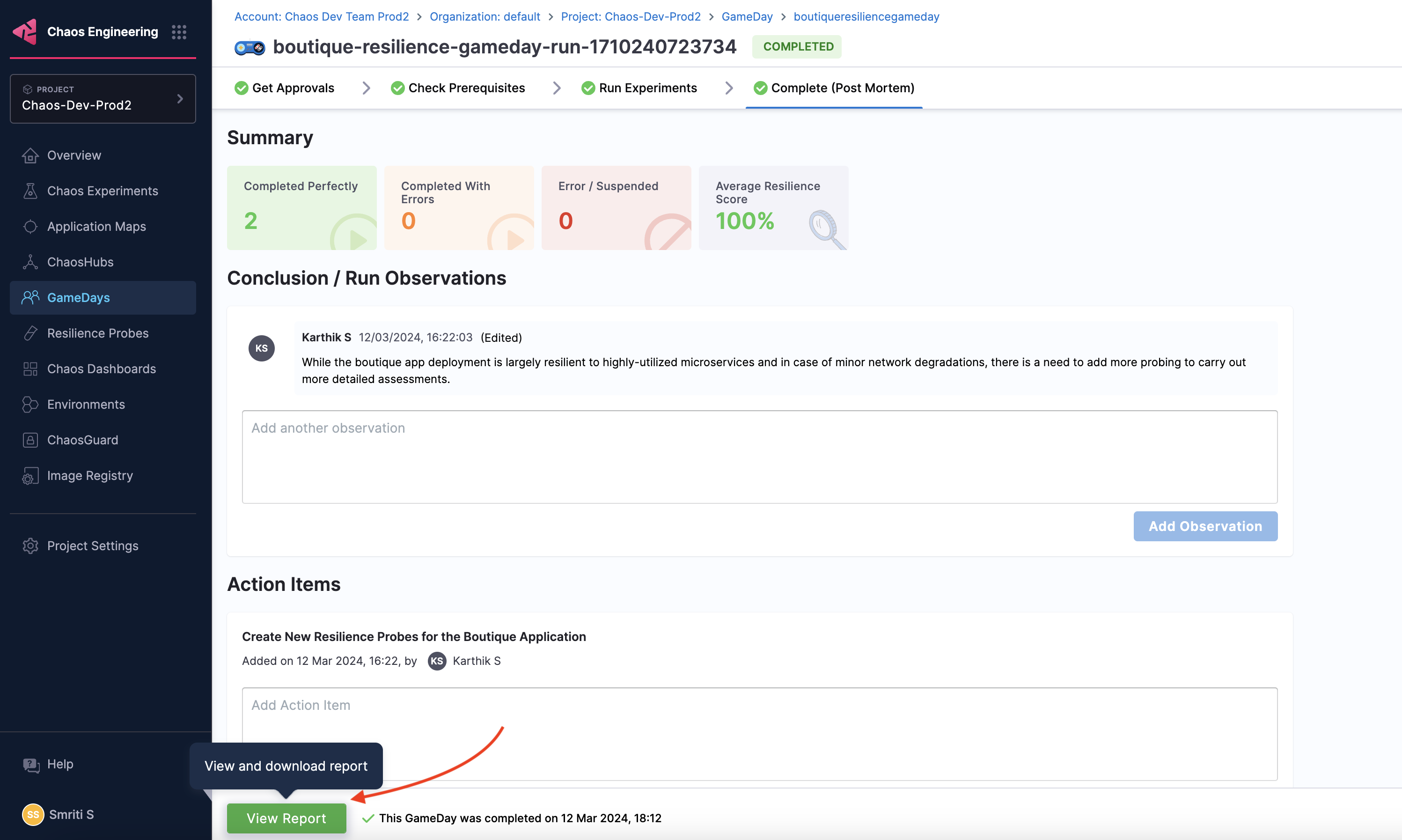 View GameDay run report