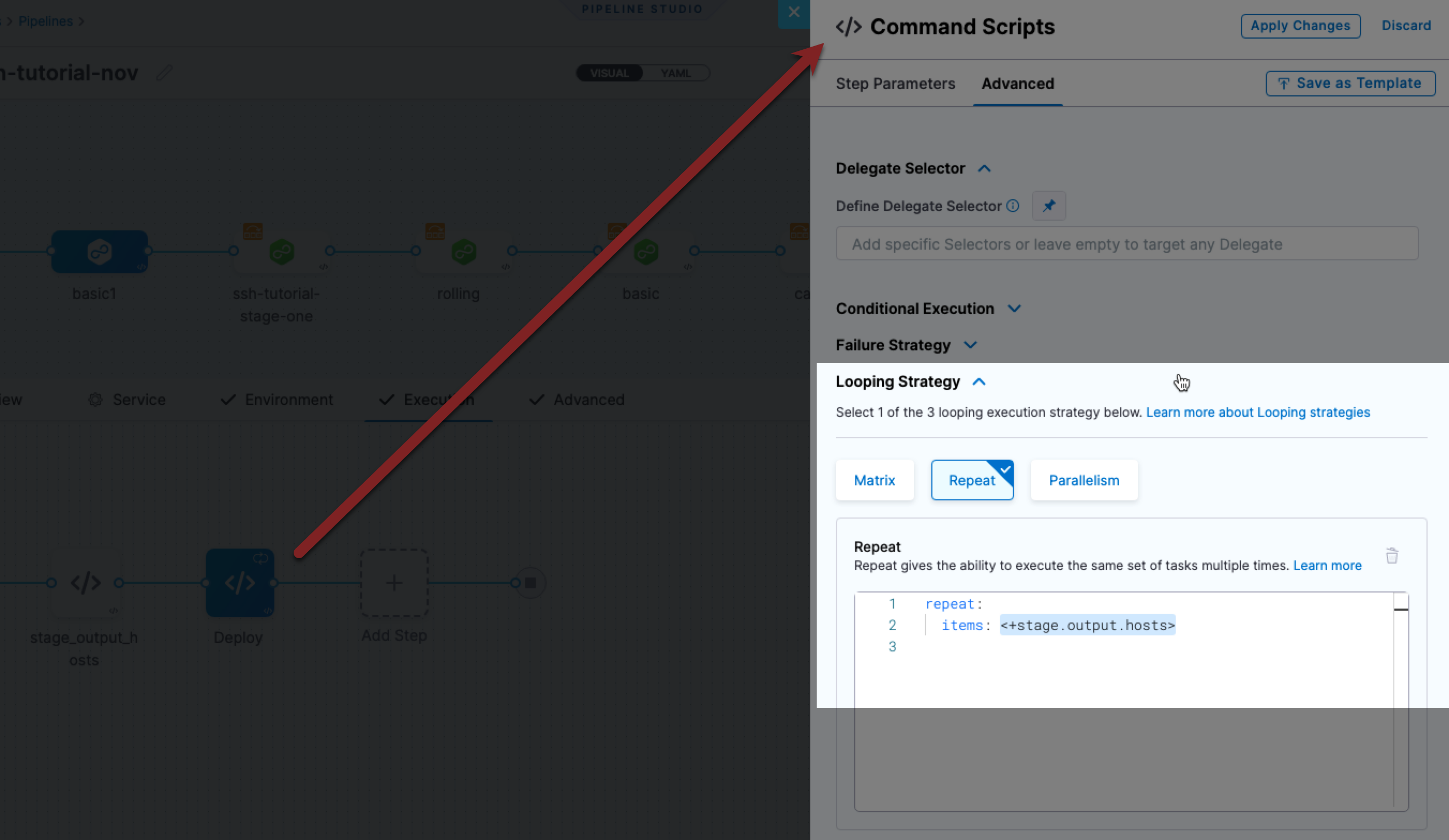 The Repeat looping strategy allows you to repeat the step for all target hosts. The strategy will iterate through the list of hosts. The list of hosts is identified with the expression <+stage.output.hosts>.